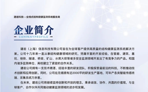 建巖(上海)信息科技有限公司,成立于2014年,十余年來(lái)只縱深于結(jié)構(gòu)變形領(lǐng)域,為國(guó)家級(jí)高新技術(shù)企業(yè)。在無(wú)錫設(shè)有生產(chǎn)基地,現(xiàn)有自主研發(fā)產(chǎn)品20余項(xiàng),硬件方面有沉降物位計(jì);沉降水準(zhǔn)儀(有線、無(wú)線);傾角儀(有線、無(wú)線);三軸測(cè)振儀;機(jī)器視覺(jué);磁致伸縮靜力水準(zhǔn)儀;固定式測(cè)斜儀;激光測(cè)距儀;表面應(yīng)變計(jì);錨索計(jì);鋼筋計(jì);軸力計(jì);拉線位移計(jì);拉桿位移計(jì);北斗GNSS;采集傳輸系統(tǒng)(內(nèi)置邊緣計(jì)算算法);軟件平臺(tái)為結(jié)構(gòu)云智能監(jiān)測(cè)平臺(tái)(V3.0版本)。